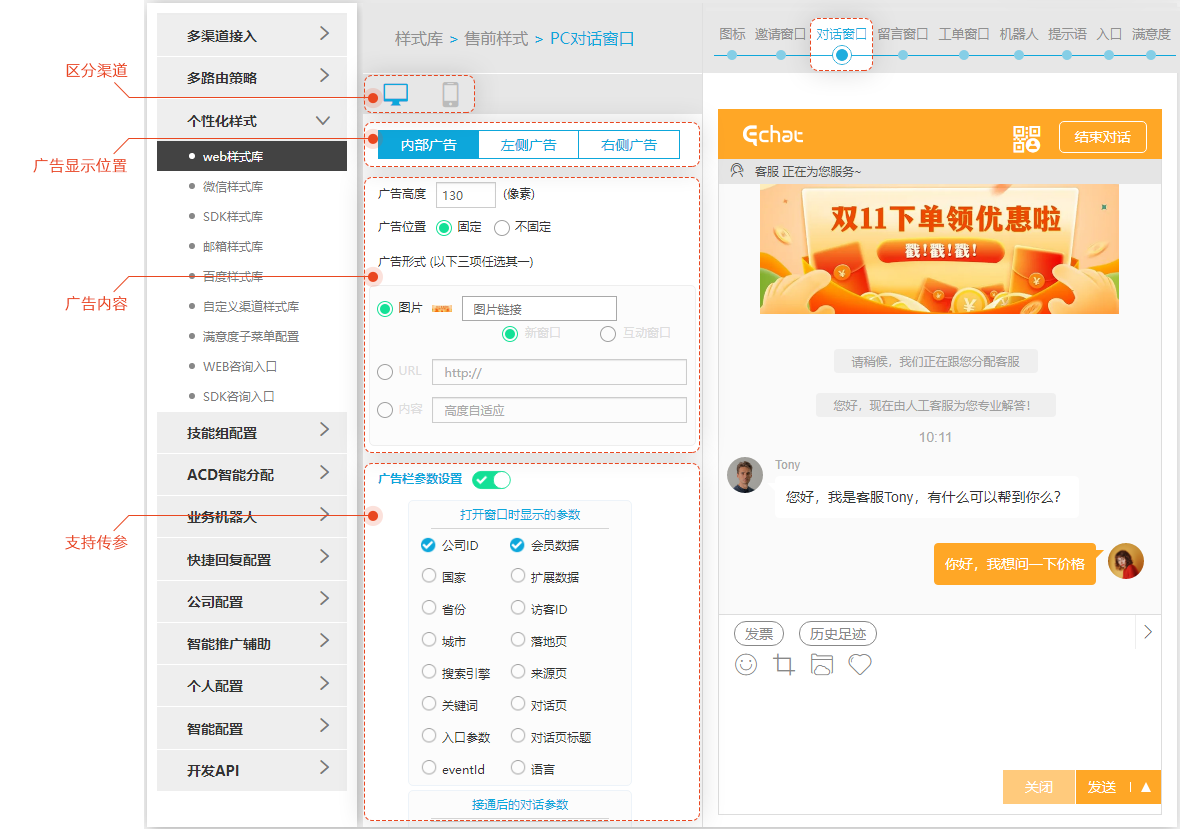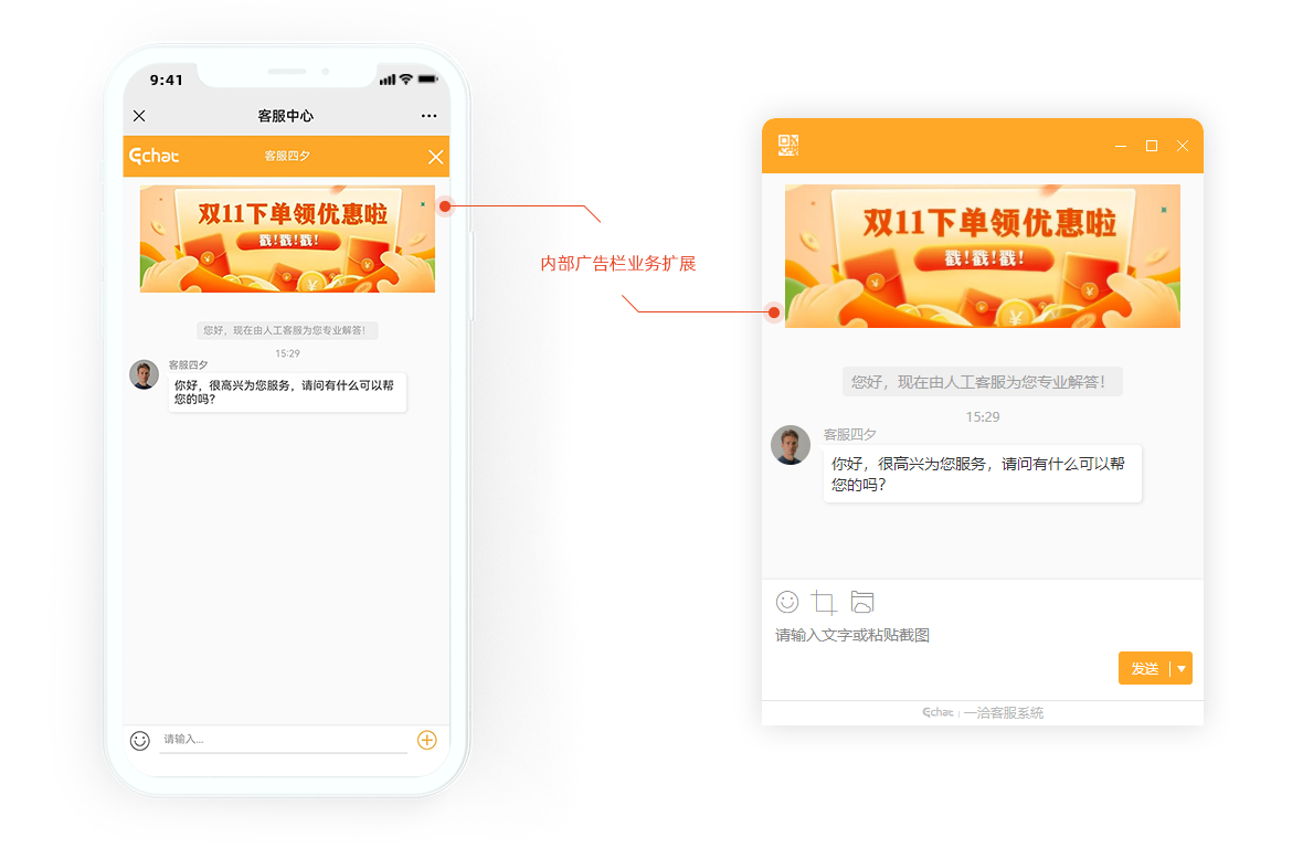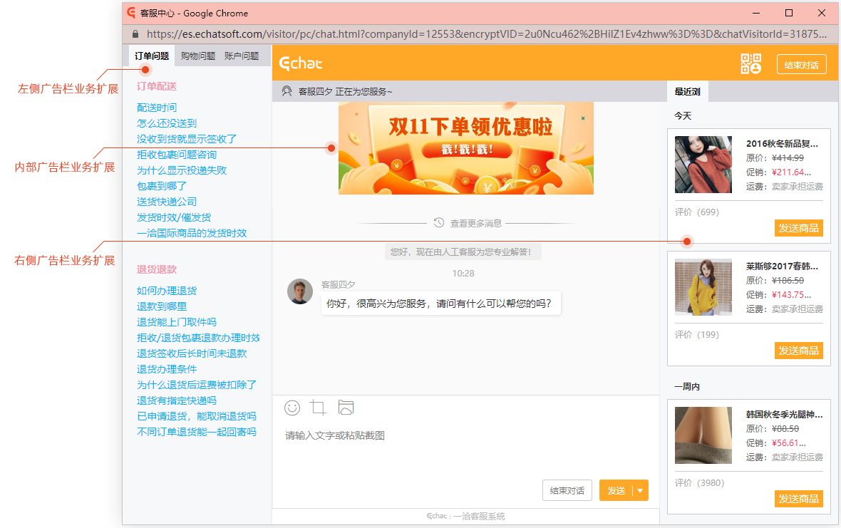 (非特殊说明,本文版权归原作者所有,转载请注明出处 :https://www.echatsoft.com/doc-detail-3811.shtml ) 「Echat」一洽专业在线客服系统,访客通过PC网站、手机网站、商城系统、微信、APP、小程序等多渠道咨询,系统智能支持:多样式选择、多路由接入、多业务整合、多角色监控、多维度分析,多平台统一管理。 一洽客服系统,给沟通多一种可能~~