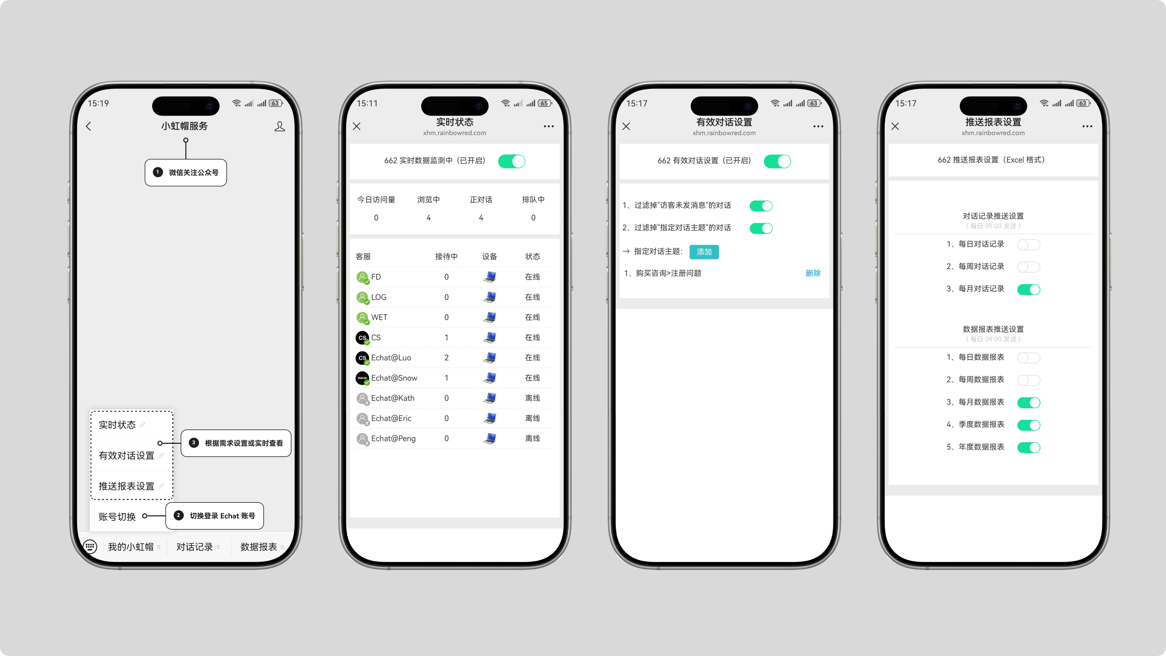 在高效运营成为企业核心竞争力的今天,管理者如何在移动中也能随时把握客服动态、洞察服务短板、驱动团队成长?Echat 为管理者量身定制的增值服务「小虹帽服务」 —— 不止是一个功能,更是您随身携带的 “移动指挥中心”