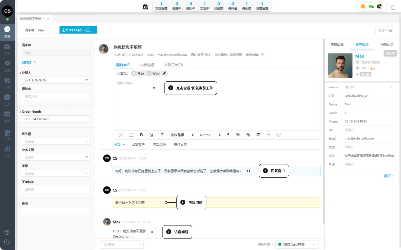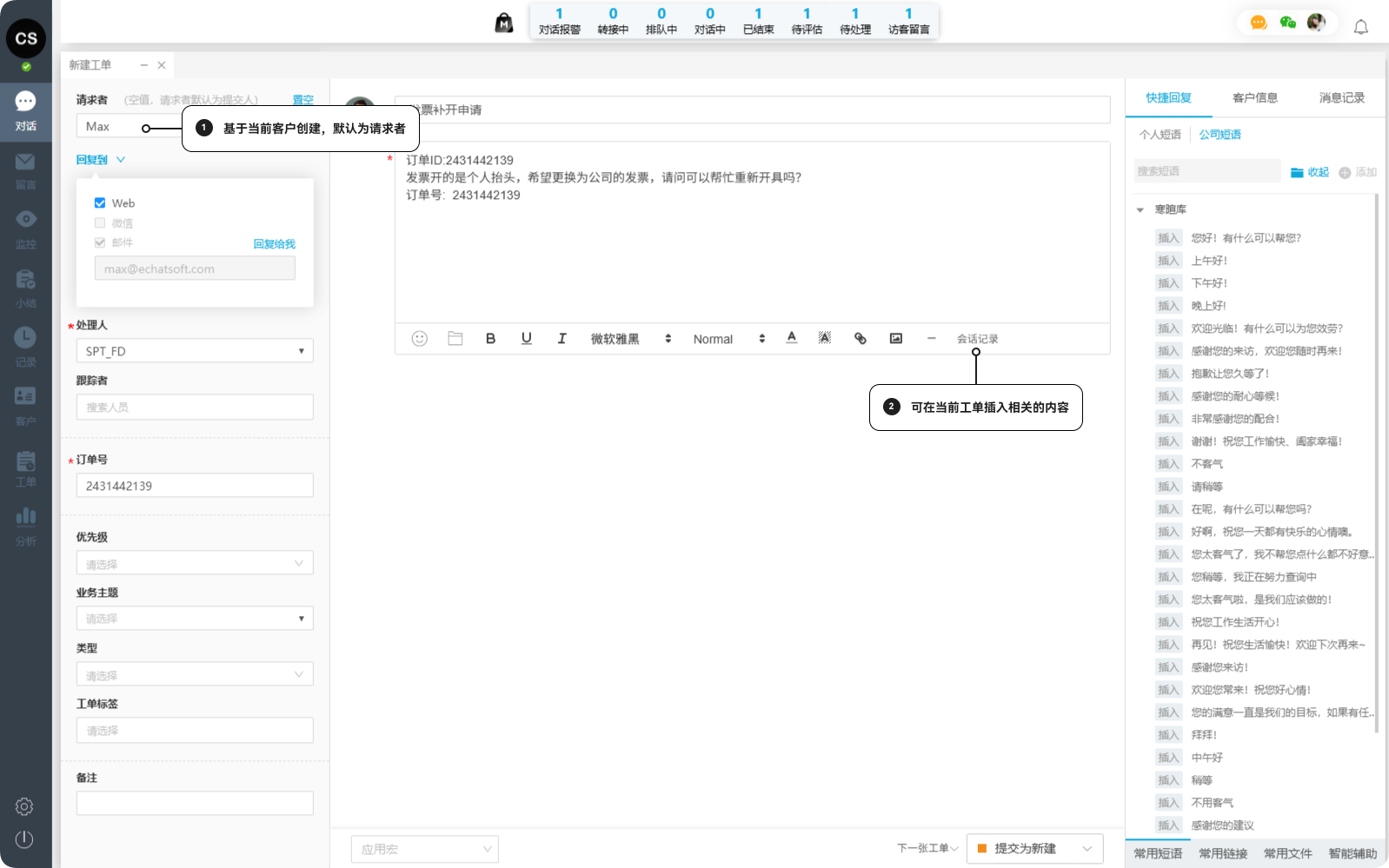 (非特殊说明,本文版权归原作者所有,转载请注明出处 :https://www.echatsoft.com/doc-detail-3816.shtml ) 「Echat」一洽专业在线客服系统,访客通过PC网站、手机网站、商城系统、微信、APP、小程序等多渠道咨询,系统智能支持:多样式选择、多路由接入、多业务整合、多角色监控、多维度分析,多平台统一管理。 一洽客服系统,给沟通多一种可能~~