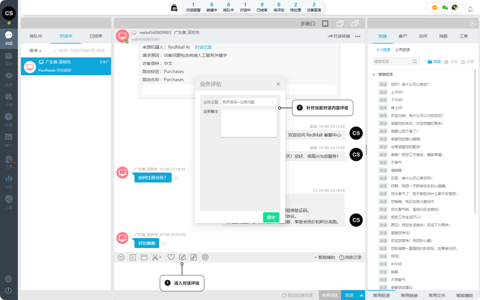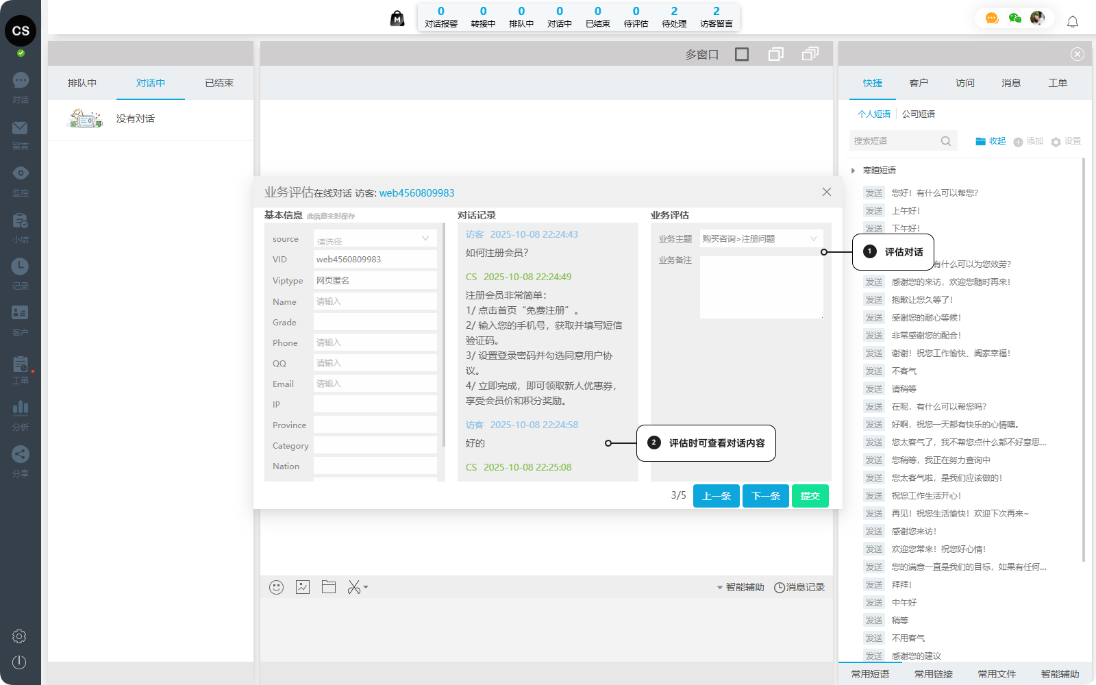 在客服日常工作中,每一次与客户的互动都是宝贵的业务数据来源。然而,如何将这些散落在对话、留言与工单中的信息转化为可供分析与优化的结构化数据?一洽业务评估功能为客服团队提供标准化、灵活化的标记与评估体系,帮助企业在服务过程中实现精细化运营与数据驱动决策。
