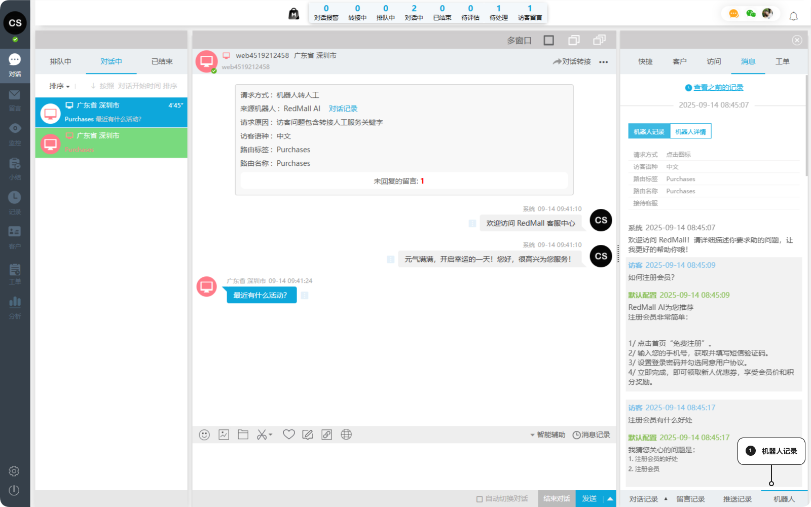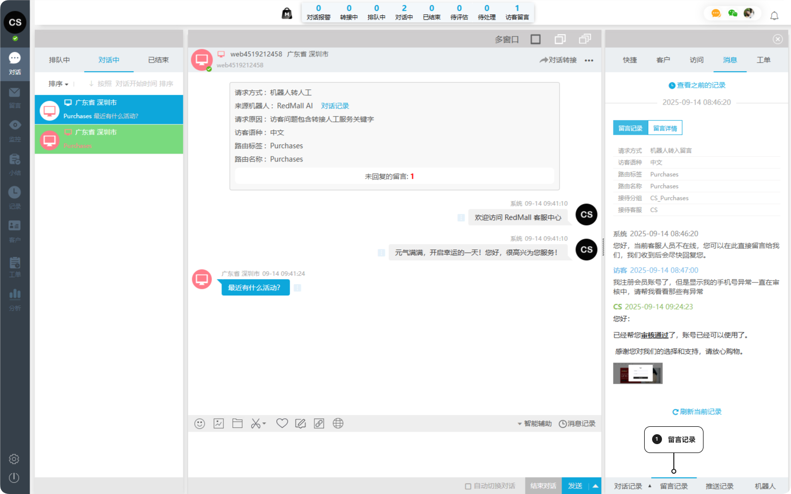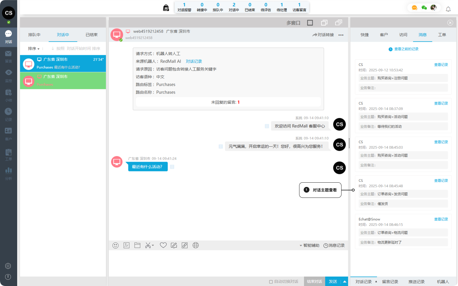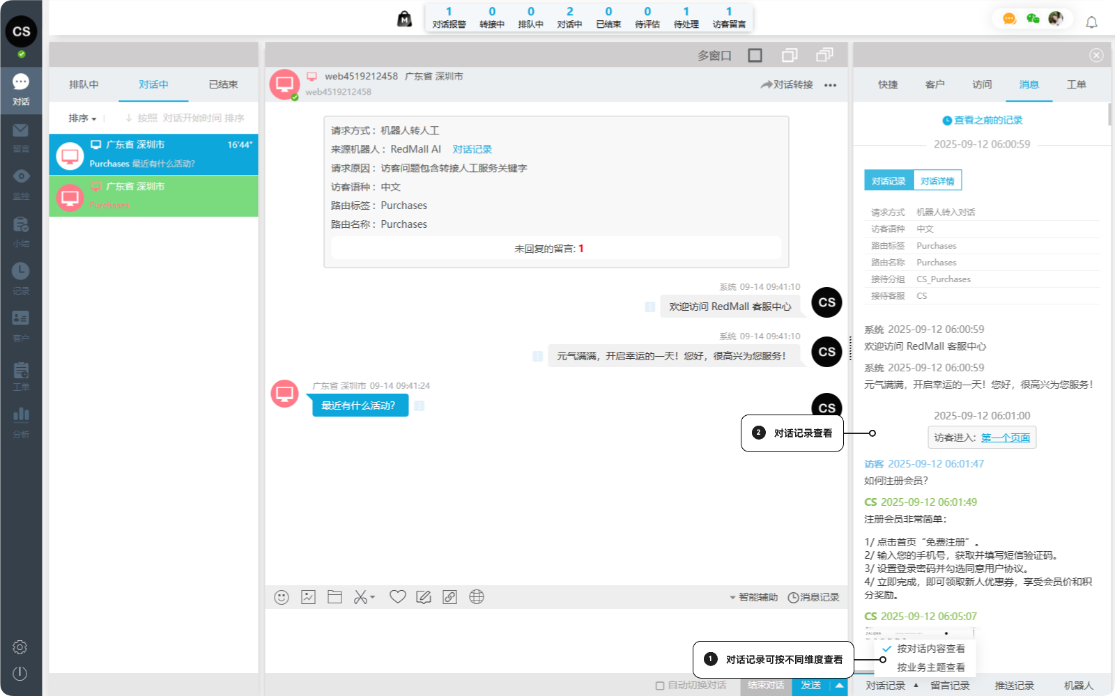 在客户服务过程中,对话结束后往往难以完整回溯客户的历史沟通记录。无论是客服交接、问题复盘,还是客户投诉处理,缺少完整的消息记录都会影响服务质量和决策效率。一洽消息记录功能为您提供客户全生命周期的沟通数据追溯能力,从对话、留言到机器人交互,从进入对话到服务结束,全程可见、一键查询。