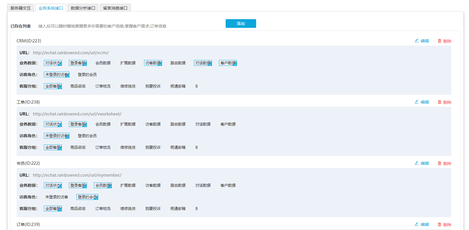 三、Echat业务系统接口,支持会员管理系统、订单管理系统、CRM管理系统、工单系统等多业务系统集成,客服在工作时能方便查看客户身份、订单、浏览记录、收藏夹、退换货等全方面信息,提高客服工作效率。